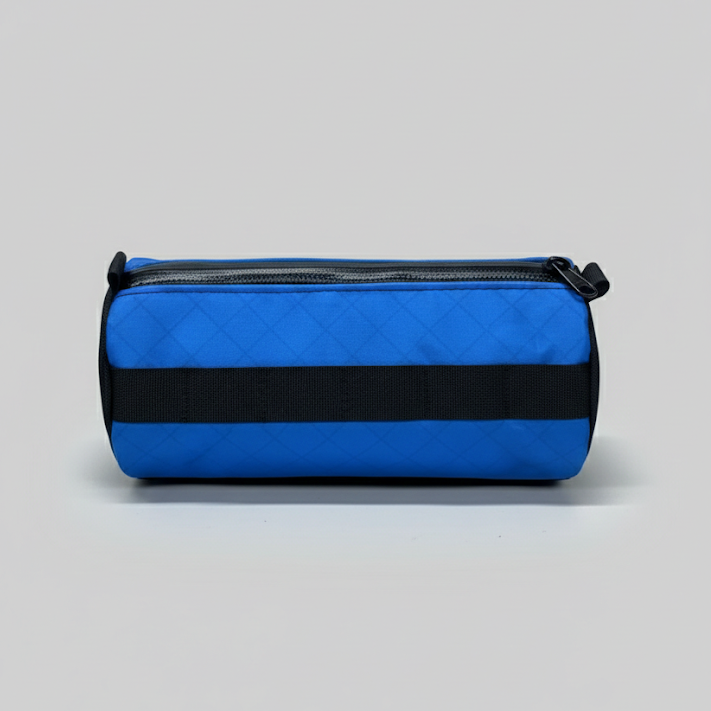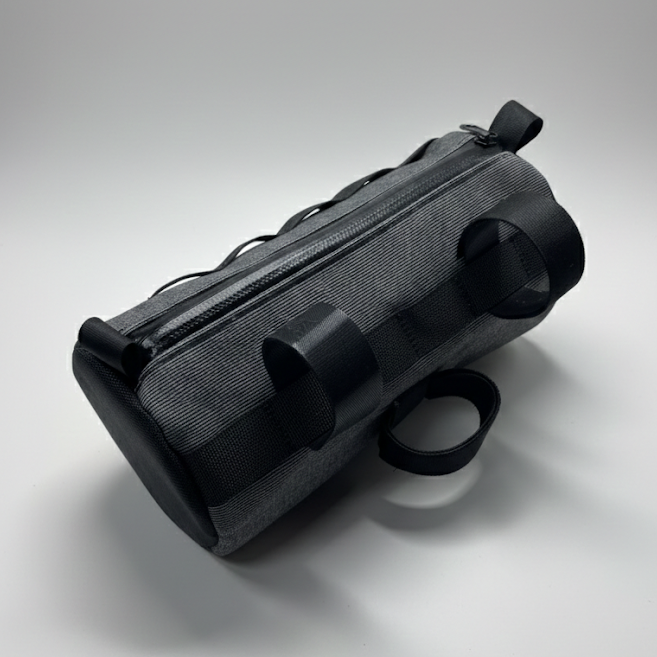 This attractive burrito style handlebar bag was crafted using a bicycle-powered sewing machine. The four-layer construction combines recycled plastic exterior fabric with up-cycled billboard material for structure, closed-cell foam for cushioning, and rip-stop lining for durability.