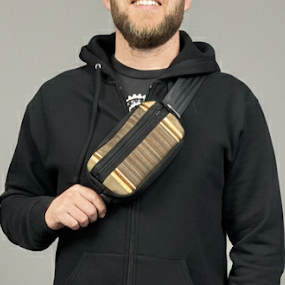 The durable awning exterior is paired with a crisp white up-cycled billboard lining. A seat belt serves as the adjustable strap—which can be adjusted to go around your waist or long enough to be used as a cross body bag (30in - 52in).